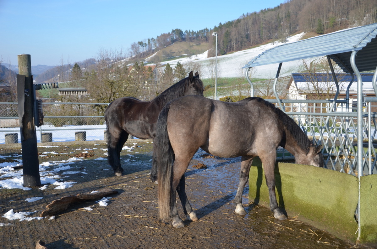 Rumi und Idske sind gut auf dem Birkenhof angekommen. Der junge Rumi hat seinen Platz in der Gruppe super gefunden, kommt von Beginn an gut ans Heu und fühlt sich sehr wohl. Idske scheint es in unserer Truppe auch gut zu gefallen. Das Fressen am grossen "Familientisch" macht ihr noch etwas Mühe, es bessert nun aber auch von Tag zu Tag. Bald gehts mit der Weidesaison los, dann wird es ihr auch leichter fallen.